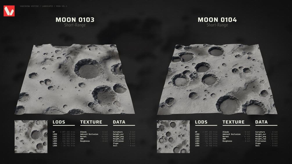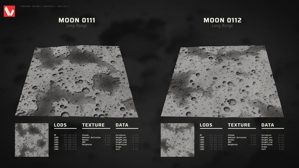 These can be used as meshes, but can also be used as landscapes in Unreal Engine thanks to the data maps (You can use the PNG / RAW heightmap files for this. Depending on the size of your landscape, you will need to adjust the Z scale. 100% for 1009, 200% for 2017, 400% for 4033, etc.). A bit more info on this in the "_readme" file included.